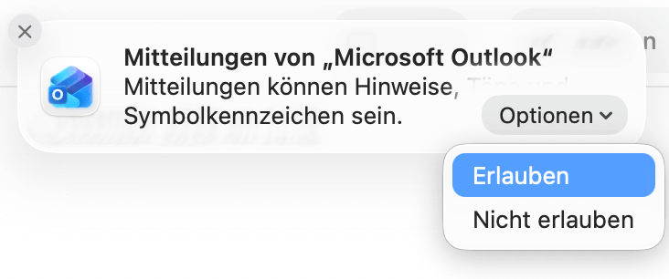 Unmittelbar nach dem ersten Start von Microsoft Outlook erscheint oben rechts möglicherweise ein Hinweis, ob Outlook Meldungen anzeigen darf. Wählen Sie in diesem Fall "Erlauben" aus dem Drop-Down Menü "Optionen".