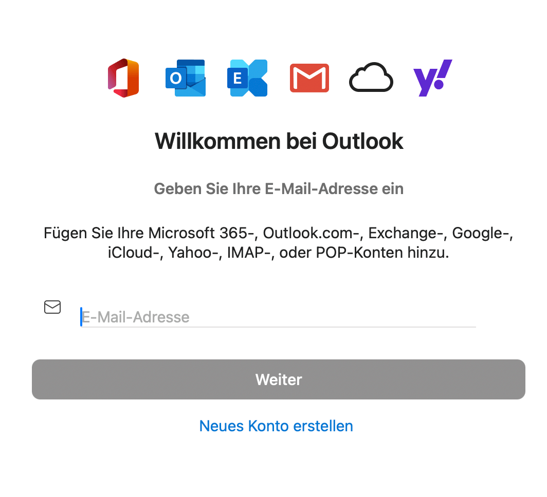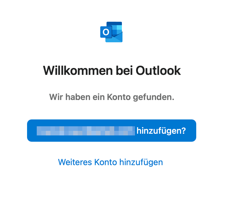 Falls Sie auf Ihrem Mac bereits Konten eingerichtet haben (z.B. in Mac-Mail oder anderen Mailrpogrammen) kann es sein, dass Outlook nachfragt, ob Sie diese in Outlook aufnehmen möchten. Wählen Sie in diesem Fall "Weiteres Konto hinzufügen".