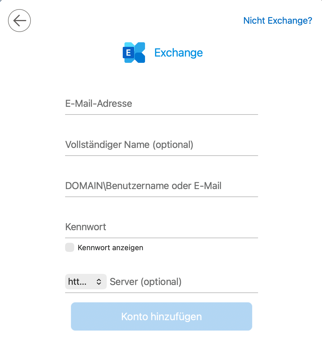 Wählen Sie in diesem Dialog oben rechts "Nicht Exchange?"